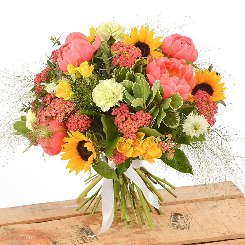Romantic and extremely summery handtied bouquet. Packed with sunflowers and peonies in gorgeous tones of orange, yellow and gold.
